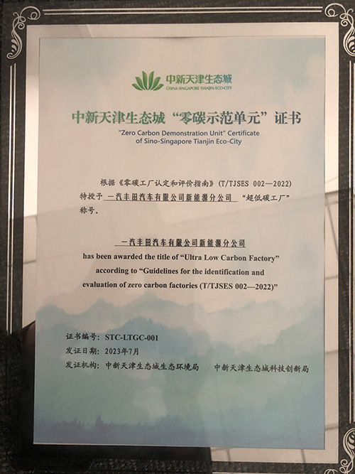 一以贯之,一汽丰田各分子公司的双碳工作也得到了所在地政府的认可:其成都工厂达到了近零碳工厂标准,获得了四川省23年碳中和8090电玩城森林舞会的荣誉证书;其坐落于天津的新能源工厂获得了天津市生态城零碳示范单位——超低碳工厂称号。