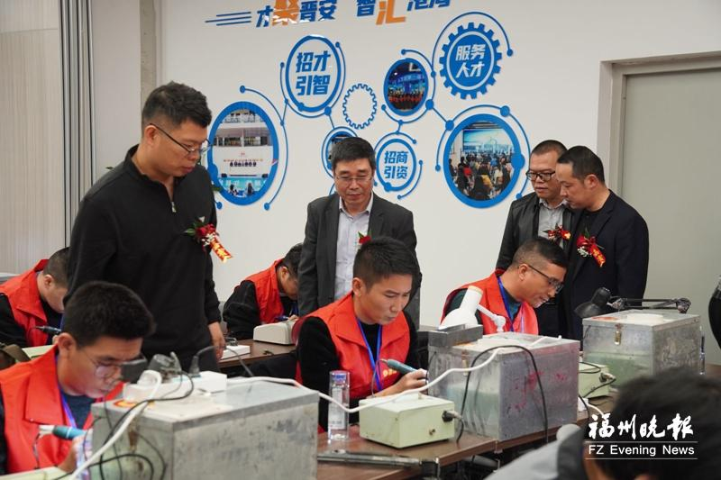 陈杰(中排左二)观看职业技能竞赛参赛选手创作。